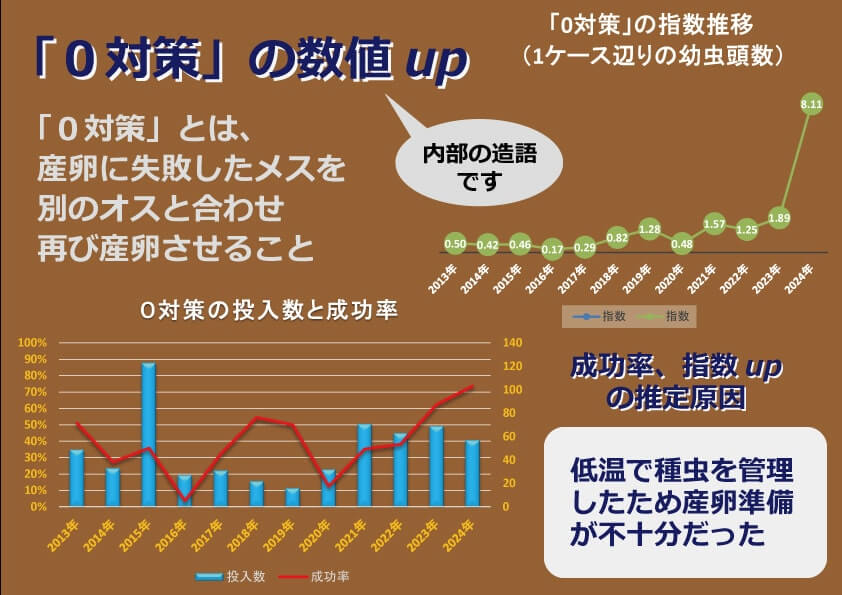「0対策」はクワカブ研究所に浸透した造語で、ペアから一頭も幼虫が採れない場合の対策をいう。メスはペアを解消、別のオスと交尾させて産卵に再挑戦する。交尾の成功率は二二年まで四~五五%で推移していた。ところが二三年は六二%、二四年は途中経過だが七四%と上昇している。