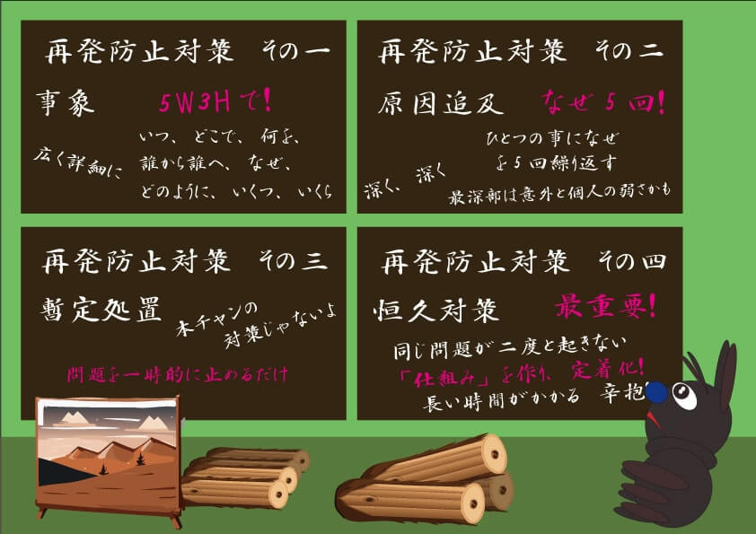 最後は恒久対策である。ポイントは「恒久」であり、二度同じことが起きない対策である。対策のゴールは再発を防げる仕組みの定着である。ロジカルシンキングは不可欠だ。恒久対策は半年、一年、数年かかることも多々あり長期戦で挑む心構えが必要である。