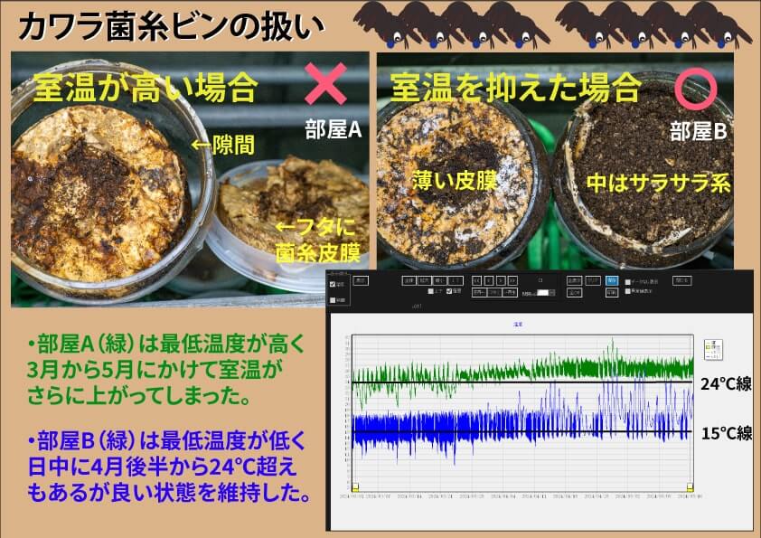 一方で部屋Bの菌糸ビン群は菌糸の被膜が薄く中が比較的パサパサしている。幼虫の死亡率は十分の一の六・三%に抑えられている。部屋が違う2つの群を比較すると、推定原因は明らかな違いがある点、すなわち室温、特に最低又は平均温度だ。部屋A群は部屋Bの一五℃前後の最低温度と違い、菌糸ビンを移動した最初の一カ月が一九~二二℃、三ヶ月後に二四℃を下らなくなった。