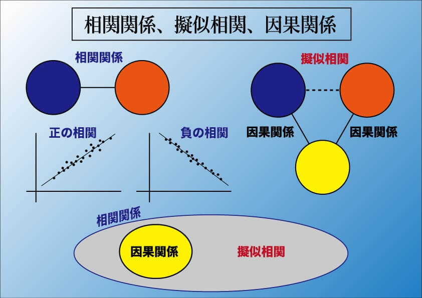 疑似相関は相関関係に含まれるが、因果関係にない。別の言い方をすると、相関関係は計算上で相関するだけで因果関係を示すものでない。例えば、熱中症患者数とアイスの売上は相関するが因果関係がない疑似相関にあたる。ちなみに因果関係はアイスの売上も熱中症患者数も気温にある。