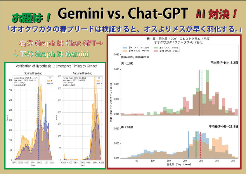 進化を続けるAI!現時点での評価はGEMINIがChat-GPTを上回ったと語られる。前回はGEMINI 3 PROで「メスはオスより早く羽化するか」という仮説を証明した。今回はChat-GPT5.2 Thinkingを使って同様の解析を行い結果に相違があるか確認した。