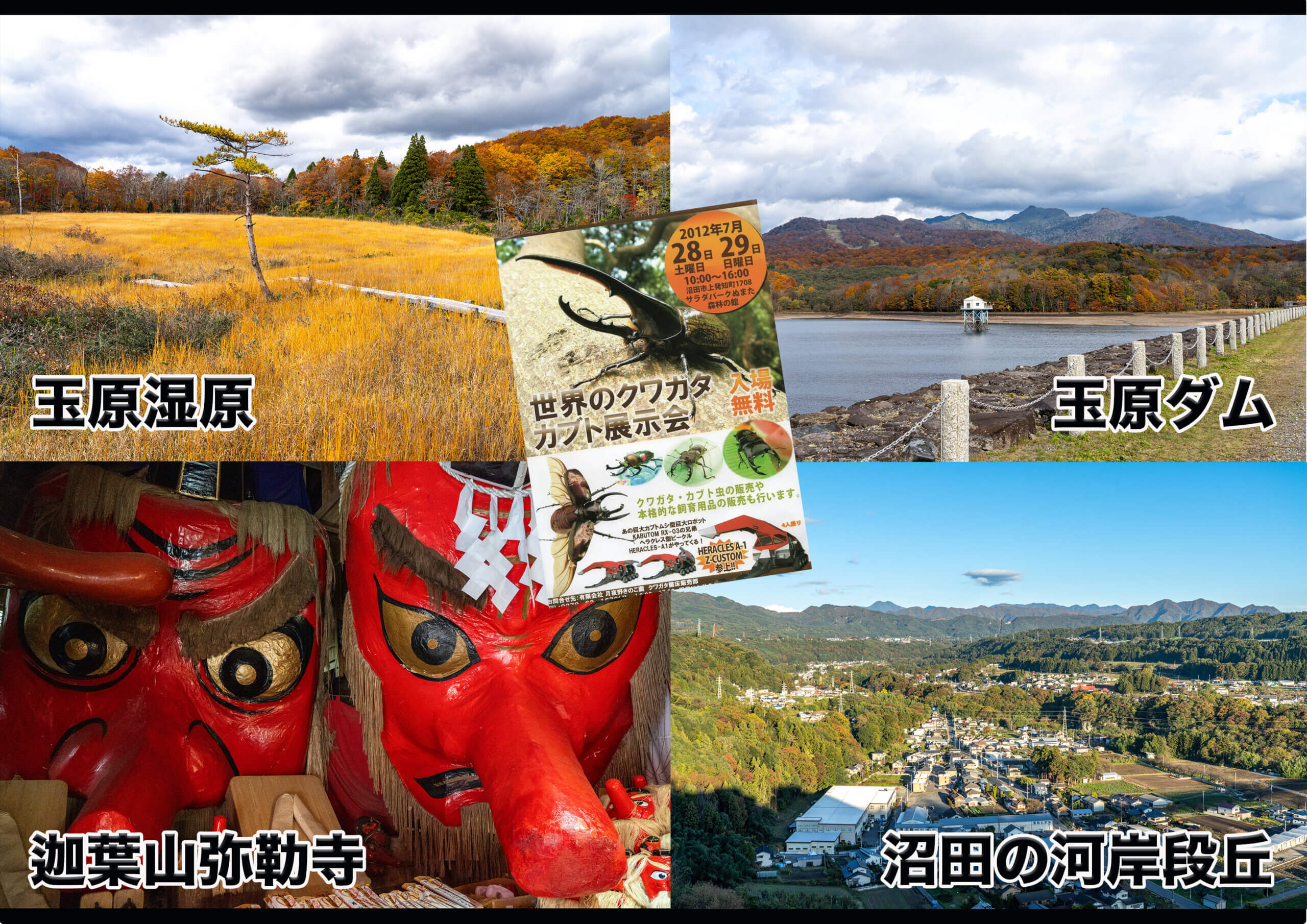 玉原への道程は沼田ICから南北に縦長の発知川の谷間を水源まで進む。「発知(ほっち)」も難読地名だ。道中には月夜野きのこ園が二○一二年にはじめて昆虫イベント「世界のクワカブカブト展示会」を開催した「サラダパークぬまた」がある。現在は「世界のクワガタ・カブト大集合」を「ノルンみなかみスキー場」で開催している。懐かしい…。