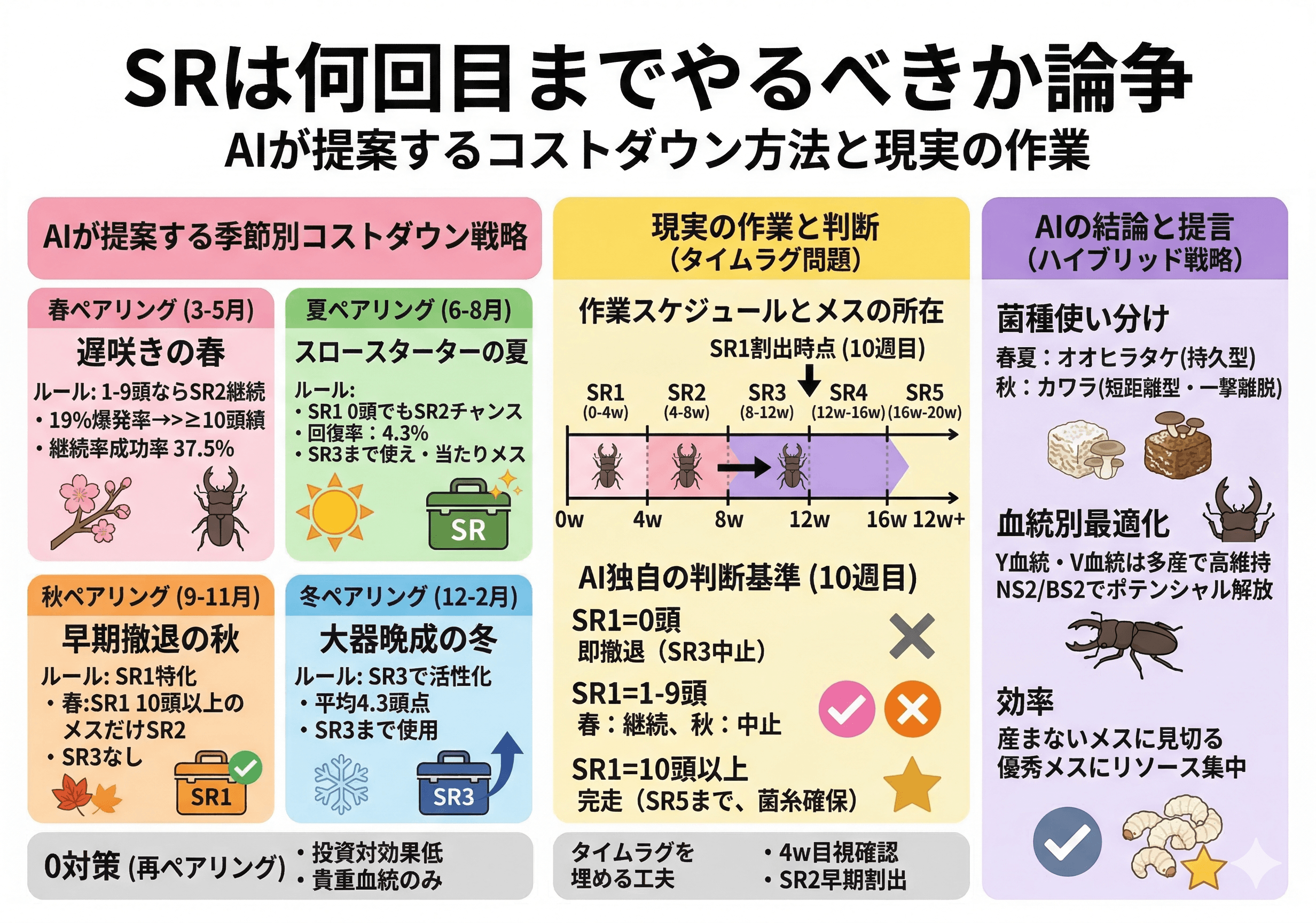 火をつけたのは筆者自身で、AI独自のまとめを要求したためだった。AIは唐突にコストダウンの提案をした。オオクワガタの産卵は交尾済みのメスを小ケースに菌糸を詰めたSR(産卵ルーム)に3回移しながら行う。AIはその回数を減らせと指摘した。筆者が作業方法やSR2、3回目の爆産データ等を指摘して、理論的に理解できる所に導いた(図の左側)。AIは季節によりSR回数の減らし方にパターンがあると理解した。