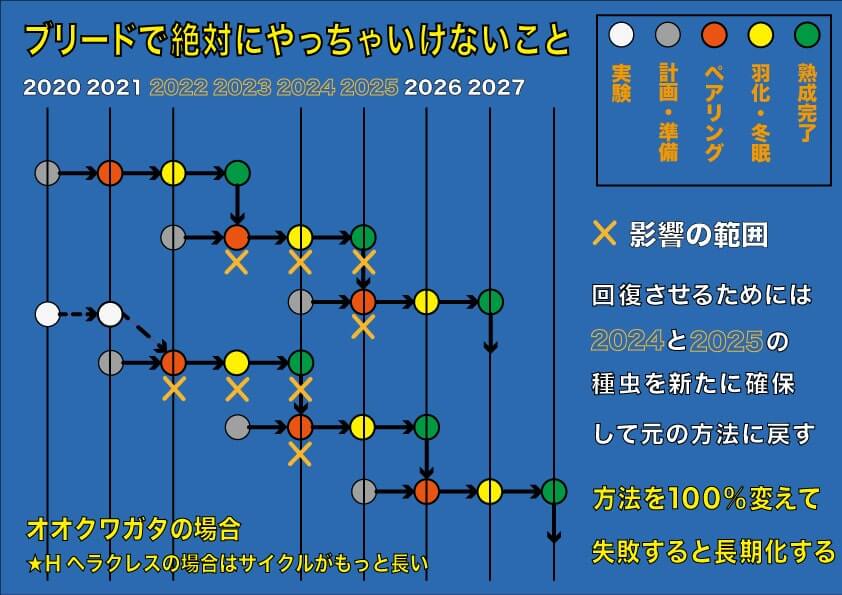 次に重要なことはサイクルの長さに対する理解だ。サイクルは長い程、数年先までダメージが残り続ける。オオクワガタのペアリングは計画と種虫準備が早いと前年から始まり、翌年にペアリング、さらに翌年に羽化、熟成させている間に冬眠と、実際に次の世代につなげるために二~三年かかる。また、翌年のペアリングは前年に生まれた幼虫の羽化と同じか後にずれ込むため、失敗に気付いても手を打てない。影響は最長で四年後に及ぶ。