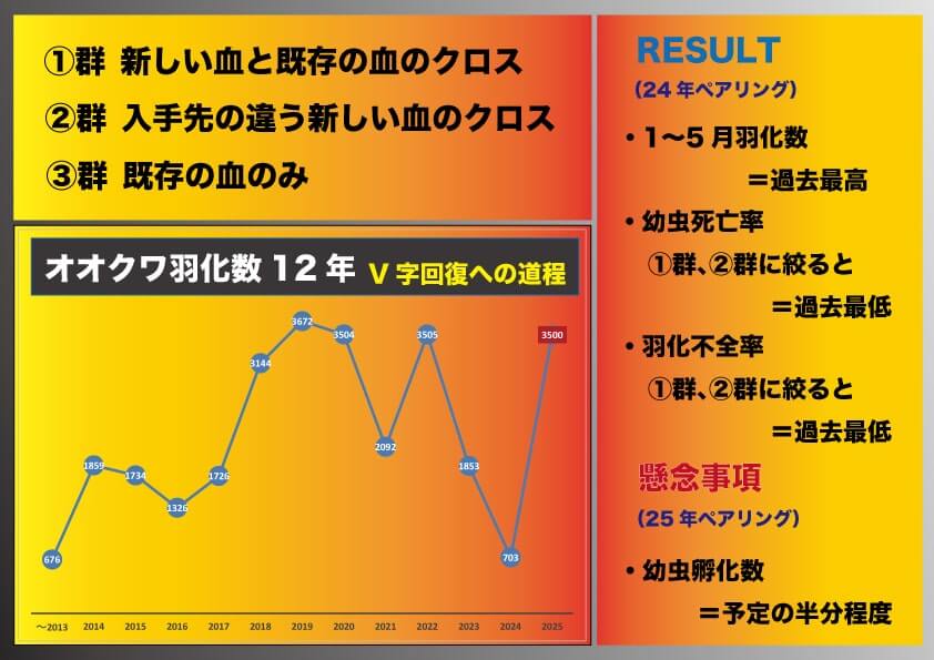 二四年ペアリングの結果は徐々に出て来た羽化数は二五年一月から五月までの期間で過去最高を更新した。一回目交換時の幼虫死亡率は減少した。三つの群を比較すると死亡率は①群と②群の新しい血が入った群で過去最低レベルだった。しかし、羽化不全は大幅な改善が確認できない。