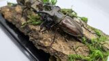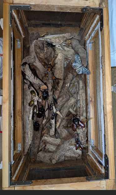 ジオラマに使用したケースは、子供が小さかったころに捕まえたカブトムシを飼育するためにホームセンターで材料を仕入れて一緒に作成したものです。中学、高校と進学するにつれて子供は昆虫採集ではなくなりケースは使われなくなりました。逆に私は還暦が近づき、仕事に少し余裕ができたので昆虫採集と標本づくりを趣味にするようになりました。今回は使われなくなったカブトムシ用のケースを利用してクヌギに集まる昆虫を再現してみました。一緒にケースを作った子供も春には大学を卒業し社会人になります。